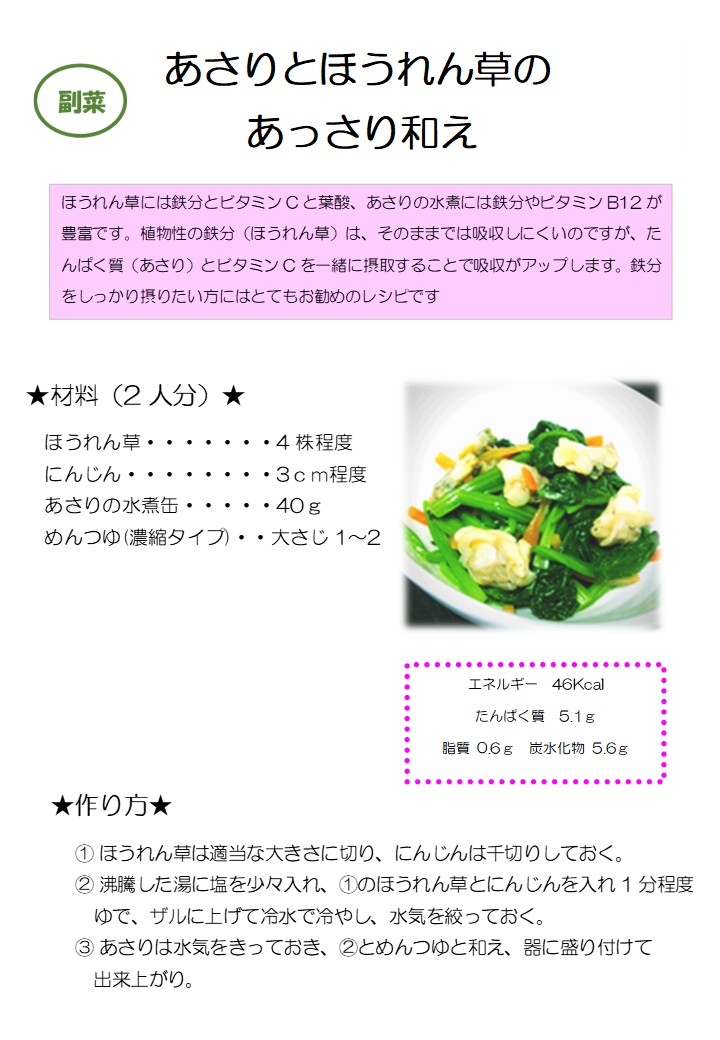 「あさりとほうれん草のあっさり和え」です