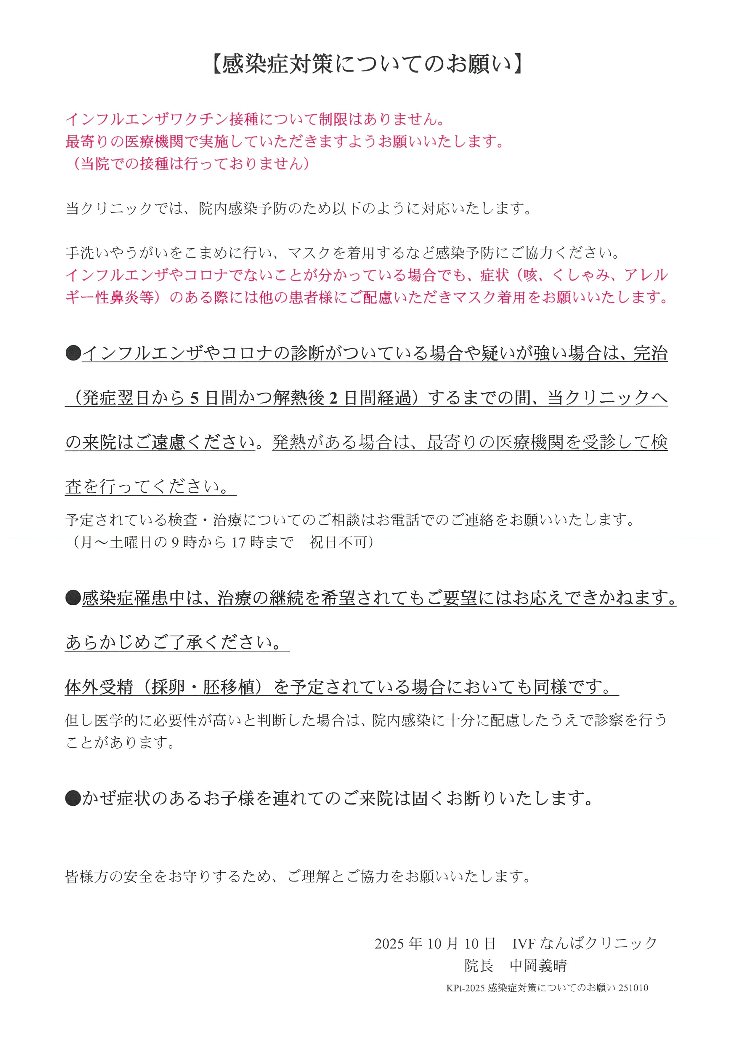 ③感染症罹患中は、治療の継続を希望されてもご要望にはお応えできかねます。体外受精(採卵・胚移植)を予定されている場合においても同様です。
