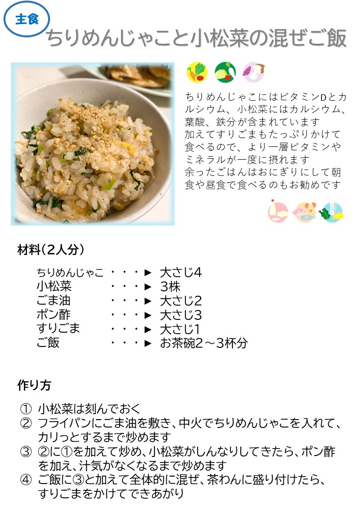 「ちりめんじゃこと小松菜の混ぜご飯」です
