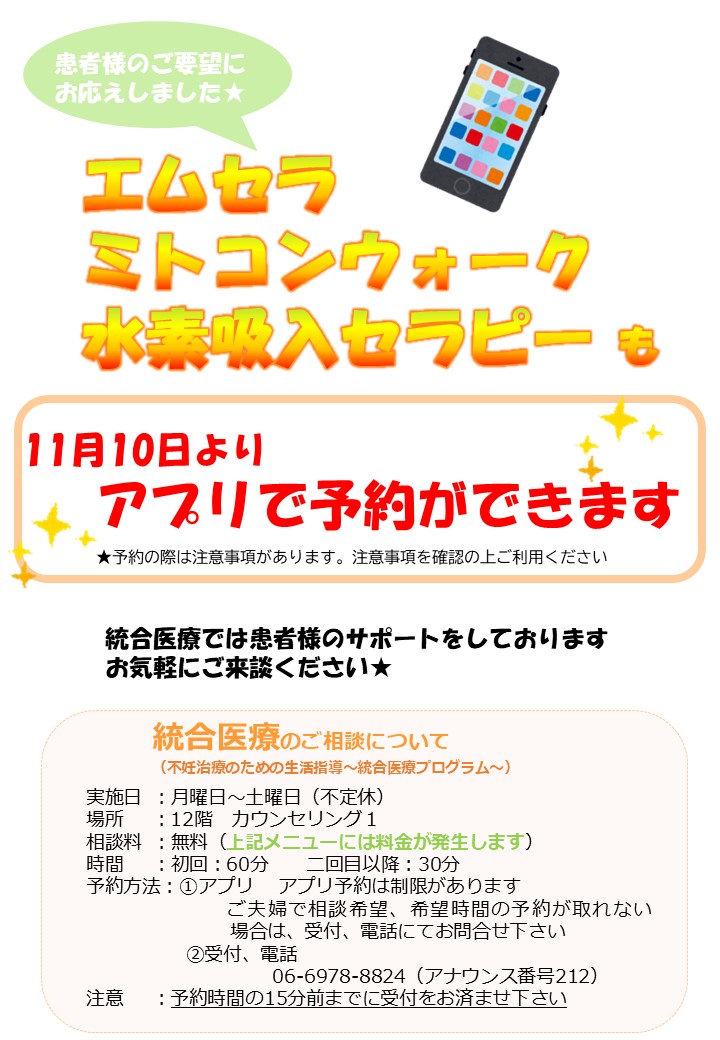 □エムセラ・ミトコンウォークは、妊娠の可能性のある時期、採卵周期の注射開始後から採卵後3日以内、胚移植決定の翌日以降など受けることができない時期があります。詳しくはお電話にてお問合せ下さい。