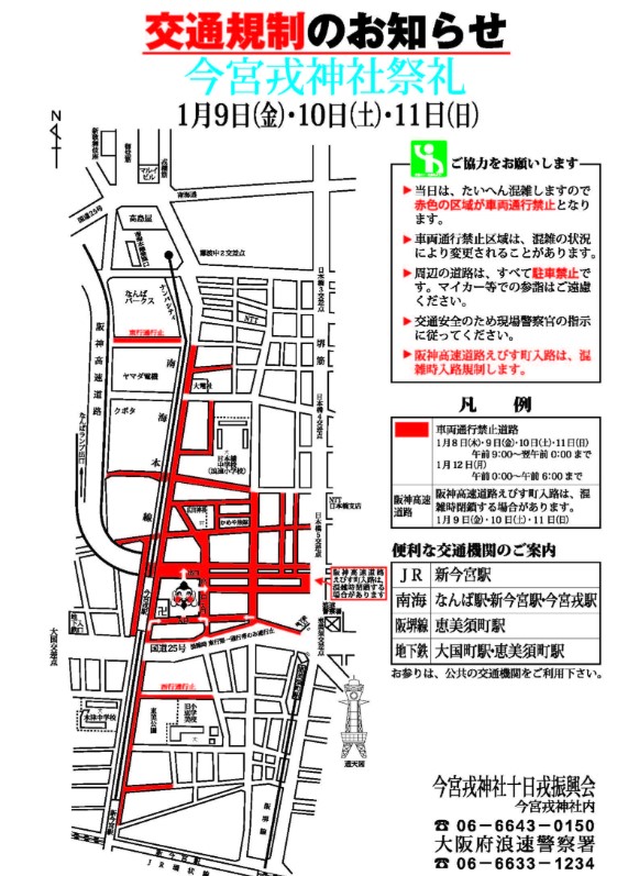 本年も1月9日(金)~11日(日)まで今宮戎神社にて十日戎が開催されます。開催期間中は下記にご注意ください