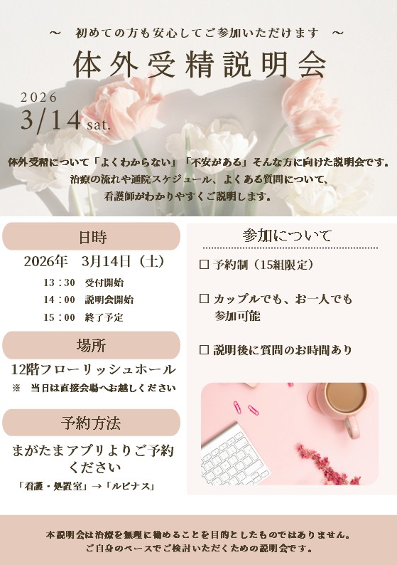 3月14日(土曜日)に体外受精についての勉強会を開催致します。